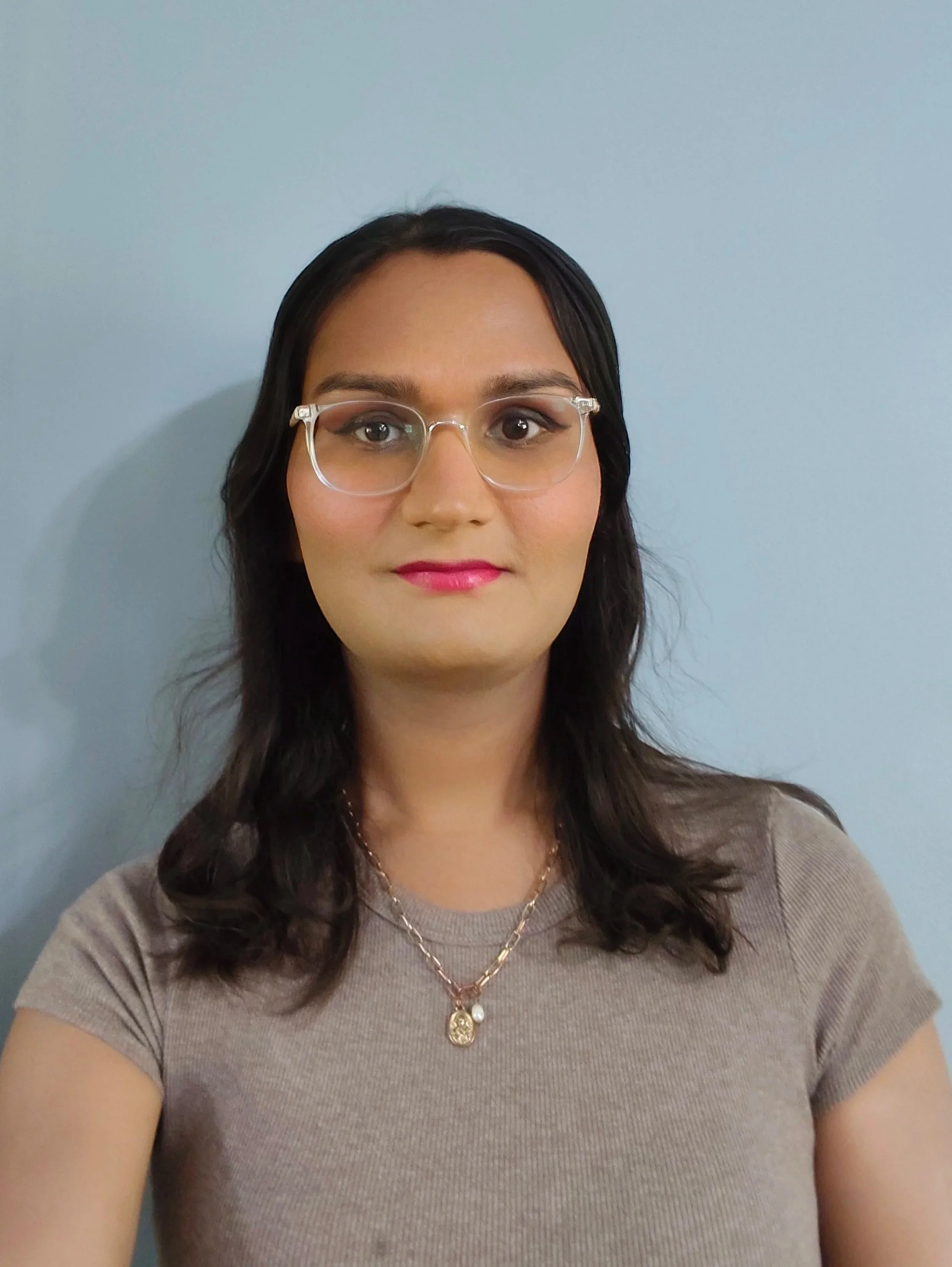 A woman with glasses and shoulder-length dark hair, wearing a beige top and gold necklace, standing against a plain light blue wall.